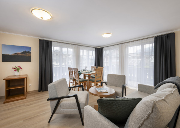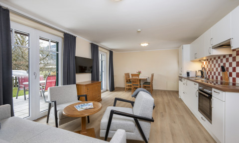 Each apartment is individually and very spaciously furnished. A fully equipped kitchen, bathroom, safe, and Wi-Fi are provided. A bicycle and ski storage room is also available in the house. Our private swimming pier on the lakeside promenade is just 100 meters away.
